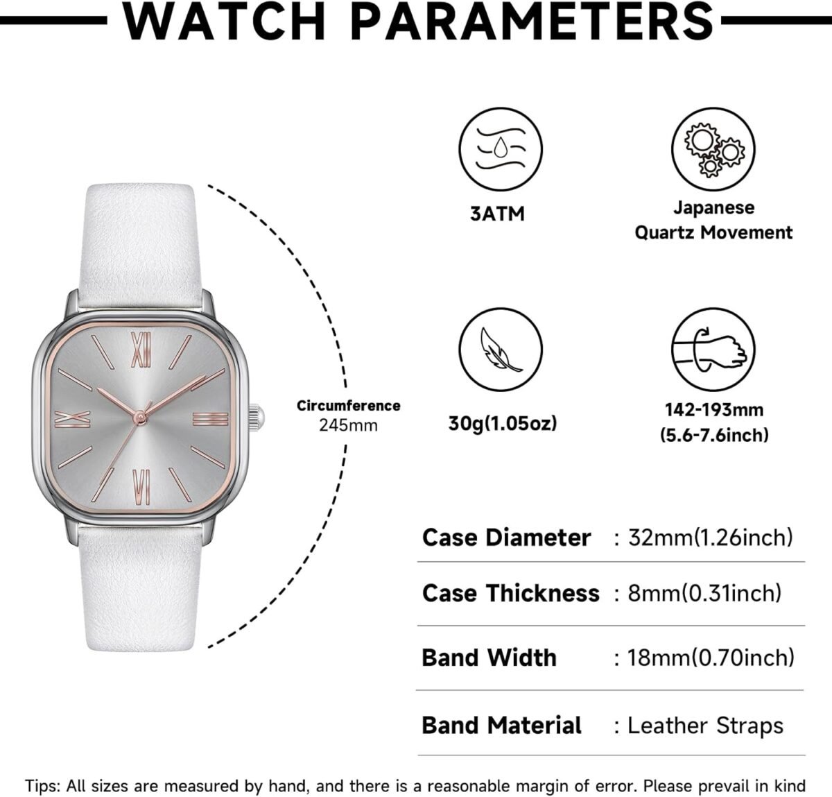 - Suitable for Most Women – Fashionable tank watch for women, Case size 32mm * 32mm; Band width 18mm; Slim thin watch thickness 8mm; Recommended for women with wrist size 142-193 mm(5.6-7.6 in), Ideal size for most women’s wrists.